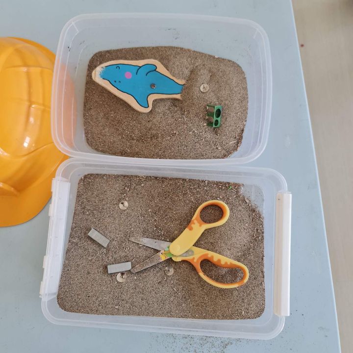 Τμήμα 2-3: Project Μαγνήτες: Τα παιδια κανοντας ανασκαφές, έπιασαν μεταλλικά αντικείμενα που ηταν κρυμμενα μεσα στην αμμο με τη βοήθεια του μαγνήτη! Τα παιδιά παίρνουν ρόλους για να κάνουν την ανασκαφή τους (Γνωστικος τομέας) Παρατηρούν ποια αντικείμενα έλκονται και ποια όχι (Γνωστικος τομέας) Στη συνέχεια τα διαχωρίζουν σε αντικείμενα που έλκονται από το μαγνήτη και σε αντικείμενα που απωθούνται (Γνωστικος τομέας) Προσπαθούν να συντονίσουν χέρια και μάτια (Κινητικός τομέας) Καθώς περιμένουν ένα ένα τη σειρά τους για να πάρουν το ρόλο τους στο παιχνίδι (Κοινωνικός τομέας)